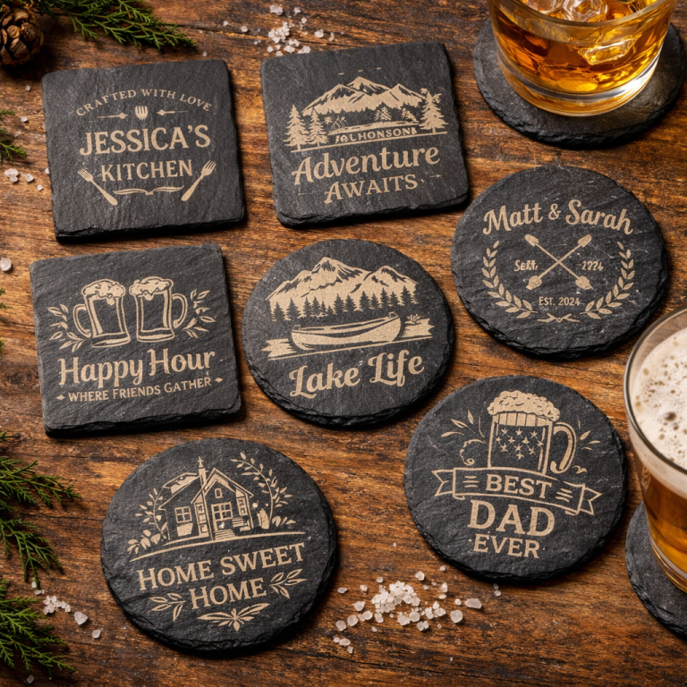 Laser engraved square and round rock coasters make a unique gift for all occasions.